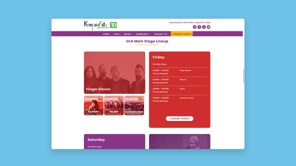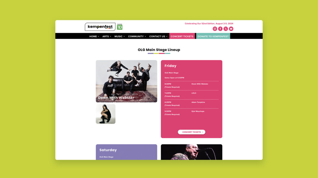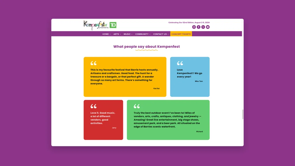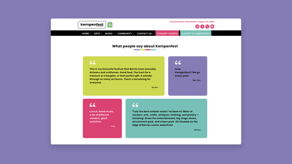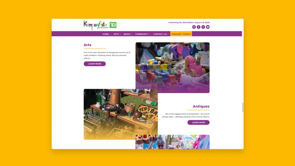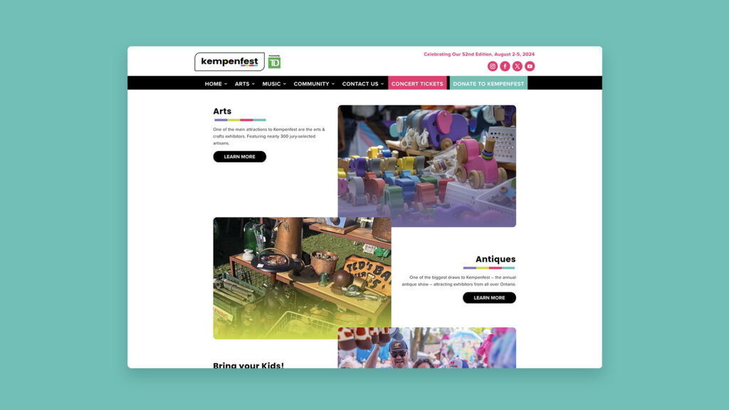 Kempenfest is one of the largest outdoor arts, crafts, and music festivals in Ontario. With so many different activities, exhibitors, and performers, they needed an easy-to-navigate website. Kempenfest’s branding expresses the vibrancy and variety of activities the festival has to offer through its colour, letterforms, and symbolism, which we used to create a unique style and palette to distinguish various sections, while showcasing their overall playfulness. In the end, we were able to take all the excitement of Kempenfest and translate it into one cohesive website.